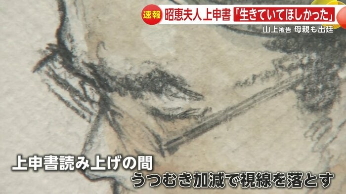 山上被告は長く伸びた髪を後ろで束ね、メガネをかけて黒いシャツとベージュ色のズボン姿で法廷へ…。上申書が読み上げられる間、うつむき加減に視線を落としていた。
