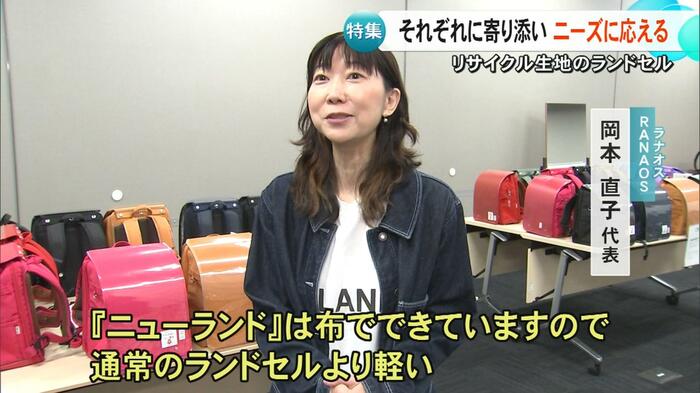 RANAOSの岡本直子代表は「一般的なランドセルは革や合皮で作るんですが、ニューランドは布でできていますので、通常のランドセルより軽い」と話す。