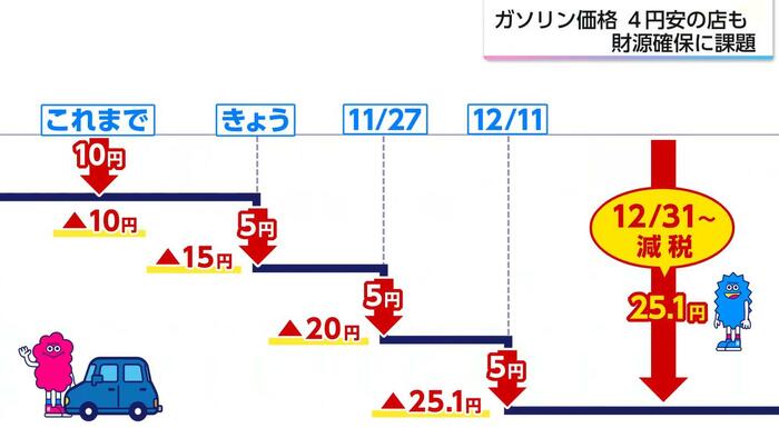 12月31日には、ガソリンにかかっていた税金25.1円分が廃止され、これに伴いガソリン価格はさらに安くなると見込まれる。しかし、軽油引取税を含む暫定税率の廃止により、地方自治体の歳入は減少する。