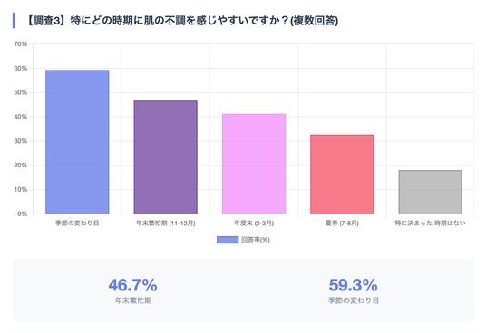 「年末繁忙期(11月~12月)」に肌不調を感じる人が46.7%で約半数に上りました。また「年度末(2月~3月)」が41.3%、「季節の変わり目」が59.3%と、仕事の繁忙期と季節要因が重なる時期に肌トラブルが増加する傾向が見られました。