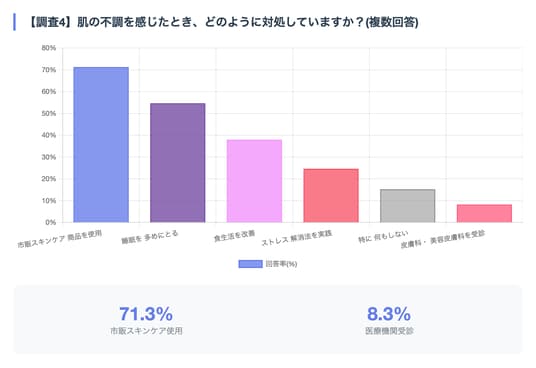 「市販のスキンケア商品を使用」が最も多く71.3%、次いで「睡眠を多めにとる」(54.7%)、「食生活を改善」(38.0%)と、セルフケアで対処している人が大多数でした。一方、「皮膚科・美容皮膚科を受診」はわずか8.3%で、医療機関への受診ハードルの高さが浮き彫りになりました。