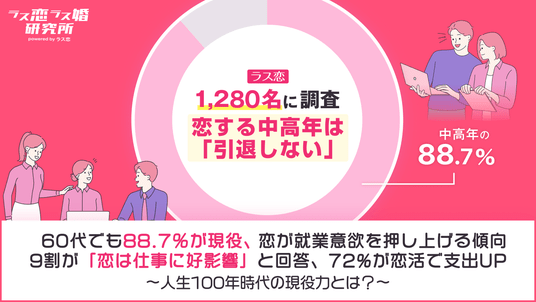 調査では、ラス恋ユーザー全体の93.4%が現役就業中、60代でも88.7%に達し、全国平均61.7%(※1)を大きく上回りました。また、91.6%が「恋が仕事に好影響を与える」、72.1%が恋活により出費が増加したと回答。中高年の恋活が、就労意欲の向上と個人消費の拡大を同時に牽引している実態が明らかになりました。
