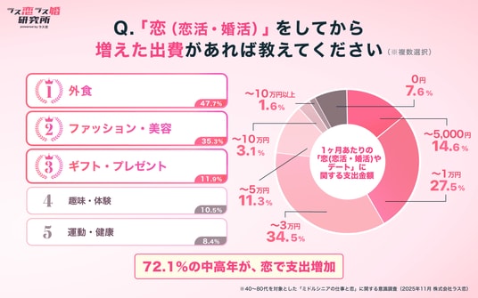 「恋(恋活・婚活)をしてから増えた出費」について、「支出は増えていない」を選択した人は3割未満にとどまり、72.1%の中高年が何らかの支出が増えたと回答しています。