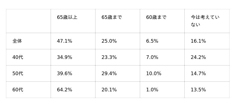 -「65歳以上も働きたい」全体:47.1%、60代男性:64.2%