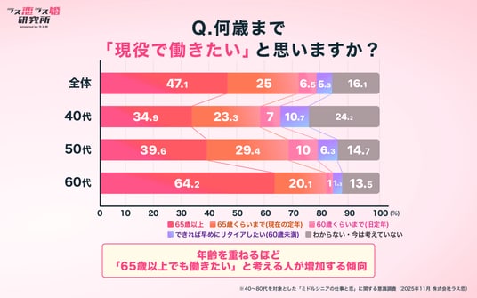 「何歳まで『現役で働きたい』と思いますか?」という問いでは、約半数の47.1%が「65歳以上でも働きたい」と回答。さらに年代別に見ると、年齢を重ねるほど「65歳以上でも働きたい」と考える人が増加する傾向が表れました。