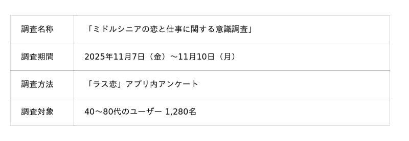株式会社ラス恋(アイザックグループ/本社:東京都渋谷区/代表取締役CEO : 山口 昂星)が運営する、対象年齢が40歳以上の恋活・婚活マッチングアプリ「ラス恋」は、2025年11月、ユーザー1,280名を対象に「恋と仕事」に関する調査を実施しました。