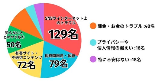最も多かったのは「SNSやインターネット上のトラブル」で129名(31.9%)、次いで「長時間利用・依存」が79名(19.6%)、「有害サイト・不適切コンテンツ」が72名(17.8%)と続きました。「特に不安はない」と回答したのは18名(4.5%)と少数でした。