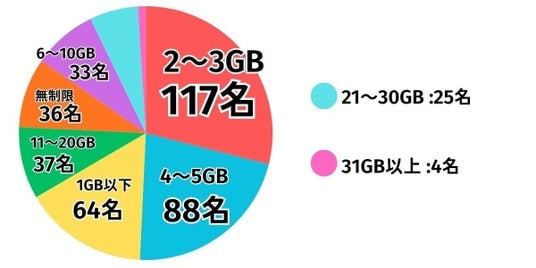 データ容量は「2~3GB」が117名(29.0%)で最も多く、「4~5GB」が88名(21.8%)、「1GB以下」が64名(15.8%)と続きました。