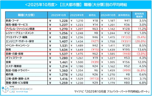 職種(大分類)別では、[飲食・フード]が1,194円(前月比18円増、前年同月比41円増)、[販売・接客・サービス]が1,200円(前月比14円増、前年同月比29円増)、[アパレル・ファッション関連]が1,219円(前月比58円増、前年同月比111円増)、[警備・清掃・ビル管理]が1,212円(前月比27円増、前年同月比75円増)で過去最高額を更新した。