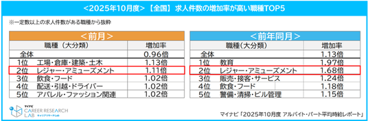 ◆2025年10月の全国平均時給は1,328円、前年同月比56円増で過去最高額。クリスマスや忘年会などの季節イベントを前に、[レジャー・アミューズメント]の求人が前年同月比1.6倍に