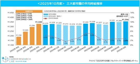 株式会社マイナビ(本社:東京都千代田区、代表取締役 社長執行役員:土屋芳明)は、アルバイト平均時給レポート(2025年10月度)を発表しました。本調査は、アルバイト・パート求人情報サイト『マイナビバイト』(https://baito.mynavi.jp/)に掲載された求人広告データを集計したものです。