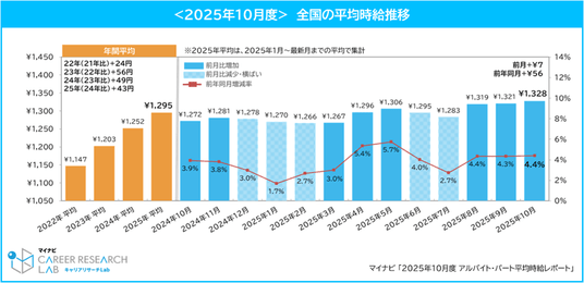 2025年10月のアルバイト平均時給は1,328円となり、3カ月連続で過去最高額を更新しました。一部のエリアでは2025年度の最低賃金が順次発効されていることも影響していると考えられます。