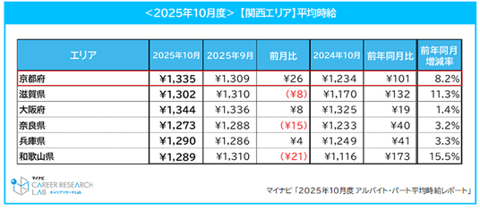 「京都府」の平均時給は1,335円(前月比26円増、前年同月比101円増)で調査開始以降最高額となった。