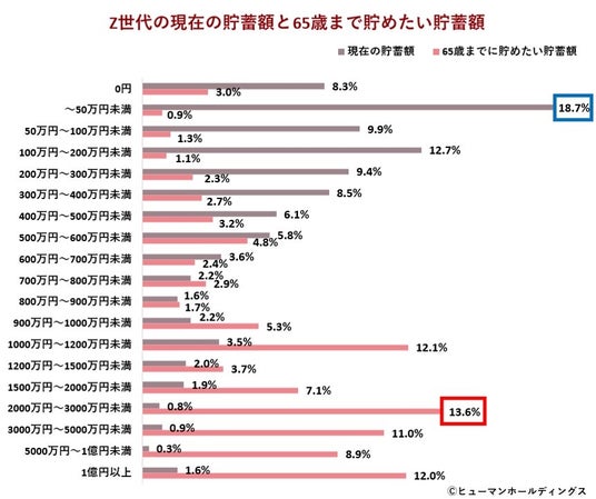 ●現在の貯蓄は少額であるが、65歳までに「2,000万円以上」を目標とする人が多く、資産形成への意識の高まりが見られる