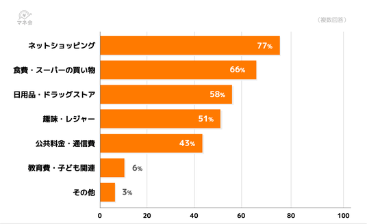 「ネットショッピング」が77%で最も多く、「食費・スーパーの買い物」66%、「日用品・ドラッグストア」58%が続きました。