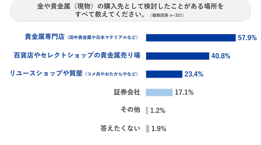 「金や貴金属(現物)の購入先として検討したことがある場所をすべて教えてください。」には、1位「貴金属専門店(田中貴金属や日本マテリアルなど)」、2位「百貨店やセレクトショップの貴金属売り場」、3位「リユースショップや質屋(コメ兵やおたからやなど)」となりました。