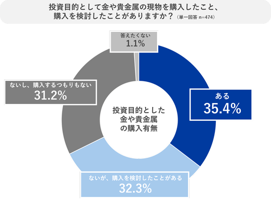 - 投資目的として金や貴金属の現物を購入したこと、購入を検討したことがある人は約7割。購入先は、貴金属専門店、百貨店のほか、リユースショップも選択肢に。