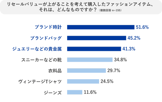 「リセールバリューが上がることを考えて、ブランド時計、ブランドバッグ、ヴィンテージTシャツ、スニーカー、ジーンズなどのファッションアイテムを購入したことがありますか?」という質問に「ある」と回答した約25%の人に対し、「リセールバリューが上がることを考えて購入したファッションアイテムそれは、どんなものですか?」という質問をしました。結果、1位「ブランド時計」、2位「ブランドバッグ」、3位「ジュエリーなどの貴金属」となりました。