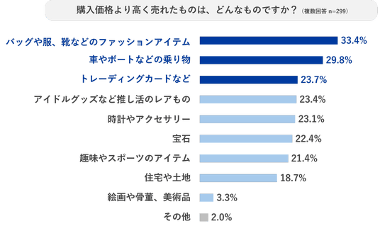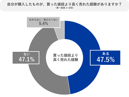 - 購入したものが「買値より高く売れた」経験がある人は約半数。「ファッションアイテム(バッグ・靴・服)」が最多で、3人に1人が経験。