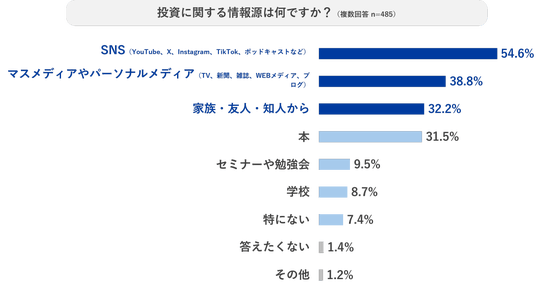 「投資に関する情報源は何ですか?」という質問では、最も多かったのが「SNS(YouTube、X、Instagram、TikTok、ポッドキャストなど)」、次に「マスメディアやパーソナルメディア(TV、新聞、雑誌、WEBメディア、ブログ)」、「本」となり、幅広い媒体から情報収集していることがわかりました。