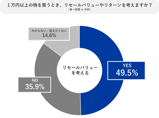 「1万円以上の物を買うとき、リセールバリューやリターンを考えますか」という質問では、YESと答えた人が約半数という結果に。