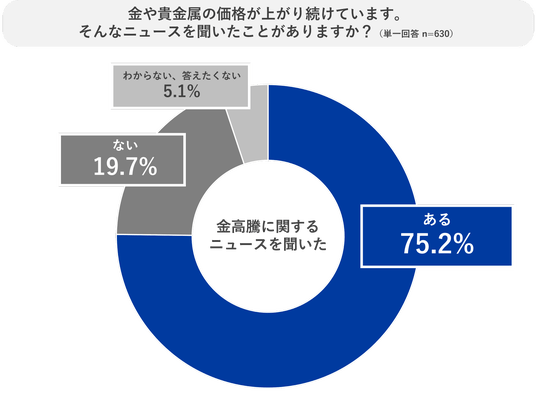「金や貴金属の価格が上がり続けています。そんなニュースを聞いたことがありますか?」には、約75%の人があると回答しました。あると回答した人を対象に、 「投資目的として金や貴金属の現物を購入したこと、購入を検討したことがありますか?」と質問したところ、「ある 約35%」、「ないが、購入を検討したことがある 約32%」となり、合わせて約7割の人が購入または検討したことがあるという結果になりました。