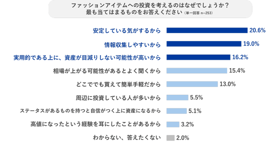 また、「ブランド時計、ブランドバッグ、ヴィンテージTシャツ、スニーカー、ジーンズなどのファッションアイテムに、投資をしてみたいと思いますか?」という質問に「思う」と回答した約40%の人に対し、「ファッションアイテムへの投資を考えるのはなぜでしょうか? 最も当てはまるものをお答えください」という質問をしました。結果、「安定している気がするから」、「情報収集しやすいから」、「実用的である上に、資産が目減りしない可能性が高いから」、「相場が上がる可能性があるとよく聞くから」という回答が多くあがりました。