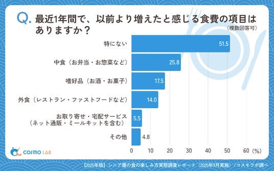 「特にない」(51.5%)が最多で、過半数は食費増を感じていません。一方で「中食(お弁当・惣菜)」(25.8%)や「嗜好品(お酒・お菓子)」(17.5%)、「外食(レストラン・ファストフードなど)」(14.0%)は増加を実感する層が一定数存在しました。「お取り寄せ・宅配サービス(ネット通販・ミールキットを含む)」(5.5%)の増加も見られます。