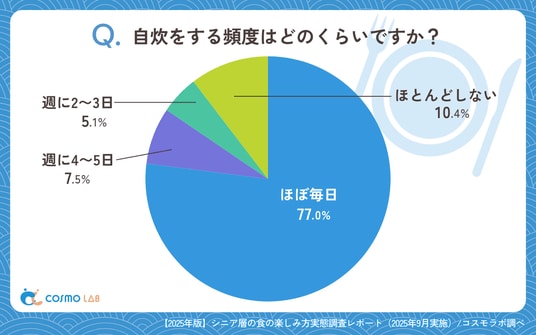 「ほぼ毎日」(77.0%)が大多数を占め、シニア世代にとって自炊は生活の中心的行動となっています。「週に4~5日」(7.5%)や「週に2~3日」(5.1%)を合わせても1割強にとどまり、「ほとんどしない」(10.4%)は少数派です。
