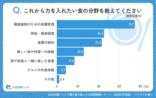 「健康維持のための栄養管理」(74.7%)が最多で、健康志向が今後も中核テーマとなることが明らかです。「時短・簡単調理」(45.3%)や「食費の節約」(43.2%)も高水準で、効率性や経済性を重視する傾向も顕著でした。