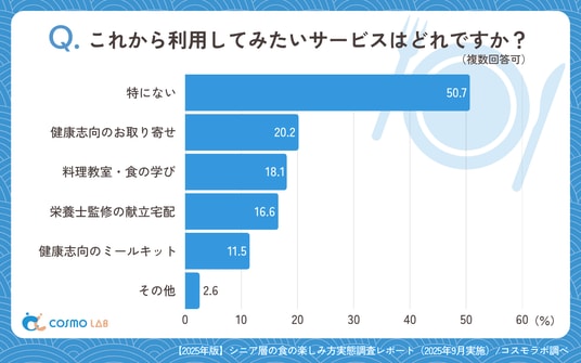 「特にない」(50.7%)が最多で、半数は現状の食生活に満足していることが示されました。一方で、「健康志向のお取り寄せ」(20.2%)や「料理教室・食の学び」(18.1%)、「栄養士監修の献立宅配」(16.6%)、「健康志向のミールキット」(11.5%)が一定の支持を得ています。