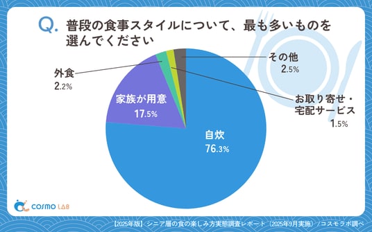 「自炊」(76.3%)が圧倒的多数で、生活基盤としての自宅調理がシニア世代に強く定着していました。「家族が用意」(17.5%)も一定数存在し、家庭内での役割分担や配偶者依存もみられます。