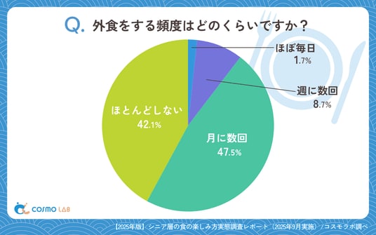 「月に数回」(47.5%)が最多で、「ほとんどしない」(42.1%)もほぼ同水準にあり、二極化傾向が見られました。「週に数回」(8.7%)や「ほぼ毎日」(1.7%)は少数派で、外食を日常的に取り入れる層は限定的です。