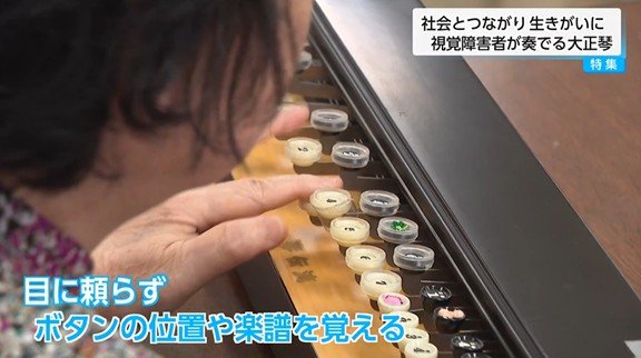 目に頼らず、大正琴のボタンの位置や楽譜を覚えることは、容易ではない。