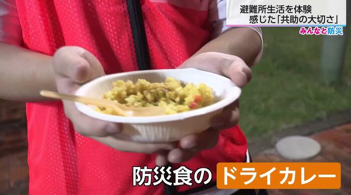 夕食は、キッチンカーで調理されたドライカレーなどの防災食が提供された。