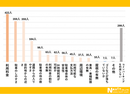 こちらのアンケートは複数回答にていただきました。コインパーキングで1番多かったのは「利用料金」で422人、次は「駐車のしやすさ」と「目的地からの近さ」が同人数で359人という結果でした。