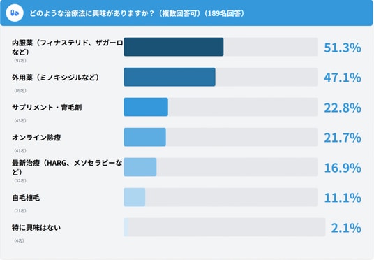 「内服薬」(51.3%)と「外用薬」(47.1%)という、医学的根拠のある標準的な治療法への関心が集まりました。一方で「サプリメント・育毛剤」(22.8%)や「オンライン診療」(21.7%)にも一定のニーズがあり、手軽さや利便性を求める層も存在します。治療法への関心は、効果への期待度と手軽さのバランスで決まっているようです。