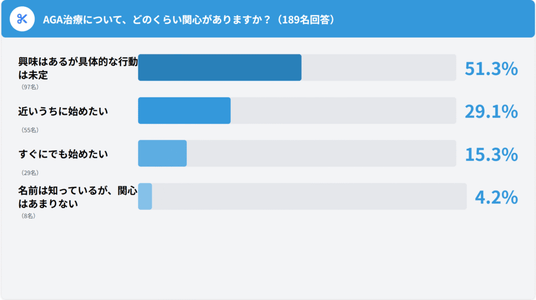 「興味はあるが具体的な行動は未定」が51.3%と半数を占めるものの、「近いうちに始めたい」(29.1%)、「すぐにでも始めたい」(15.3%)を合わせると44.4%にのぼります。これは、AGA治療が身近な選択肢として広く認知され、行動に移す一歩手前の潜在顧客が非常に多いことを示しています。