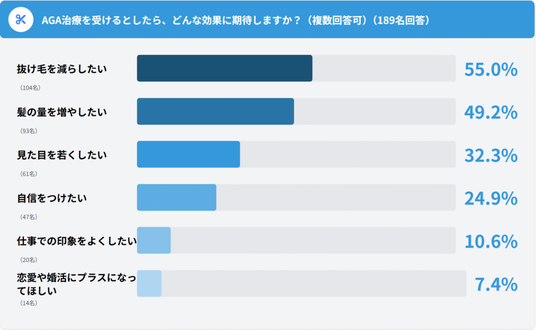 「抜け毛を減らしたい」(55.0%)、「髪の量を増やしたい」(49.2%)という直接的な発毛・育毛効果が期待の中心です。さらに「見た目を若くしたい」(32.3%)、「自信をつけたい」(24.9%)といった、QOL(生活の質)の向上に繋がる内面的な効果への期待も高く、薄毛治療が単なる容姿の改善だけでなく、自己肯定感を高める手段として認識されていることが分かります。