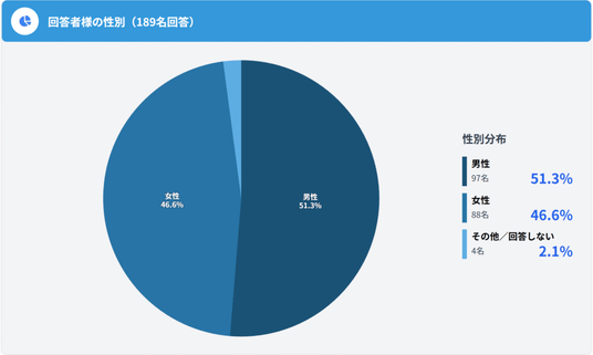 回答者は20代後半から40代までが約7割を占め、薄毛を意識し始める主要な層の意見が反映されています。また、性別は男性が51.3%、女性が46.6%とほぼ半々であり、薄毛の悩みが性別を問わず広がっている現代の状況を明確に示しています。特に女性の回答比率の高さは、女性向け薄毛治療市場の大きなポテンシャルを示唆しています。