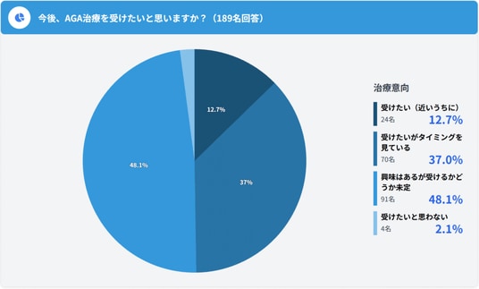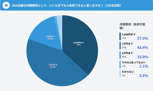 AGA治療未経験者で興味がある189名を対象に意識調査を実施した結果、半数以上(51.3%)が「興味はあるが具体的な行動は未定」と回答しつつも、44.4%が「すぐにでも始めたい」「近いうちに始めたい」と高い関心を示していることが明らかになりました。治療をためらう最大の理由は「費用」(58.2%)であり、全体の約8割が希望する月額費用を「1万円以下」と回答。市場拡大には価格戦略が重要であることが示唆されました。