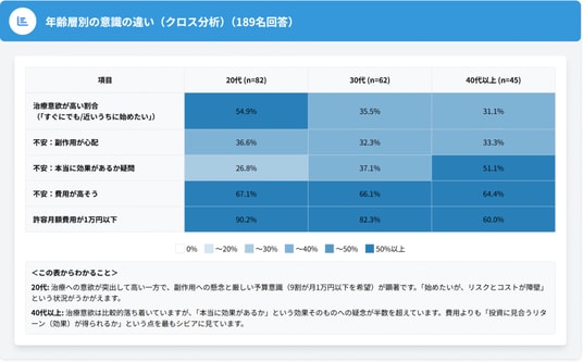 - 年齢層による違い: 20代は「意欲は高いがリスクが不安」。40代以上は「効果への信頼性」を求める。