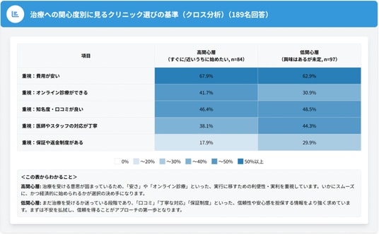 高関心層(すぐにでも/近いうちに始めたい): 「費用が安い」(68%)、「オンライン診療」(41%)、「通いやすい立地」(40%)など、治療開始のハードルを下げる実利的な項目を重視する傾向が強いです。低関心層(興味はあるが未定): 「知名度・口コミが良い」(51%)、「医師やスタッフの対応が丁寧」(45%)、「保証制度」(27%)など、信頼性や安心感を担保する情報をより重視しています。