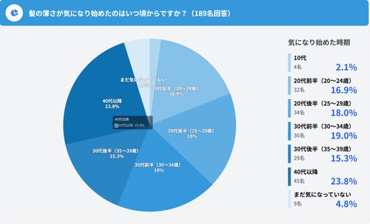 「40代以降」が23.8%で最多ですが、「20代」「30代」で気になり始めた層もそれぞれ約35%ずつ存在し、薄毛の悩み始める年齢が広範囲にわたっていることが分かります。若年層で悩みを抱える人が多いことは、早期治療への関心の高さにも繋がっていると考えられます。