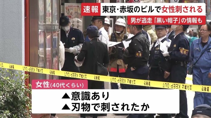 東京・港区のビルで、女性が男に刃物で刺される事件があり男は現在も逃走している。