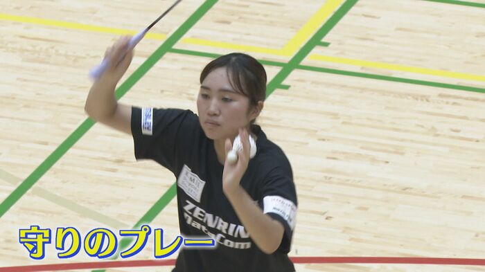 太宰府市に住む大学生の矢ヶ部真衣さんは、強烈なスマッシュが持ち味だ。