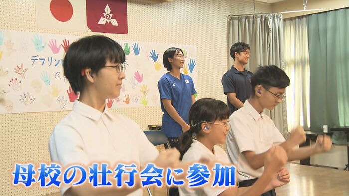 2025年8月29日、母校の久留米聴覚特別支援学校で行われた壮行会に参加した真衣さん。後輩の子どもたちにメダル獲得を約束した。