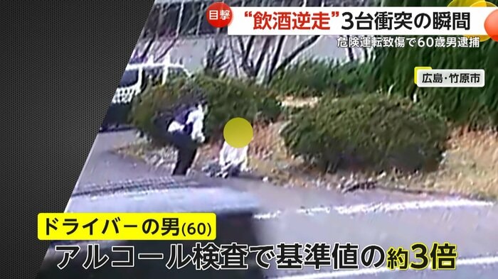 広島・竹原市で8日、酒気帯び状態の男が運転する軽自動車が逆走し、3台の車と衝突した。