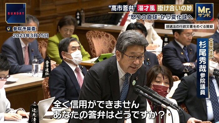 立憲民主党・杉尾秀哉参院議員(2023年3月15日・参院予算委「放送法の行政文書をめぐる質疑」):