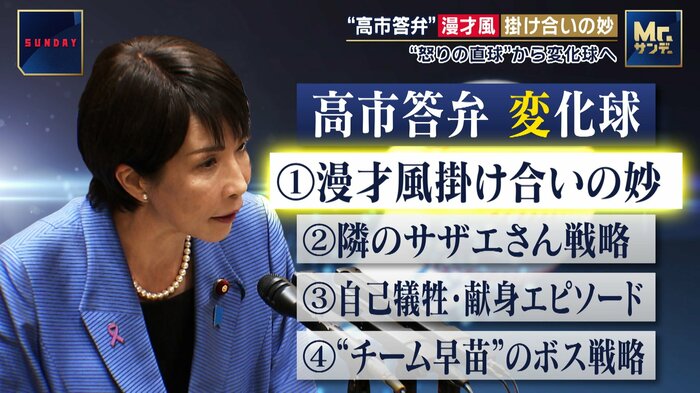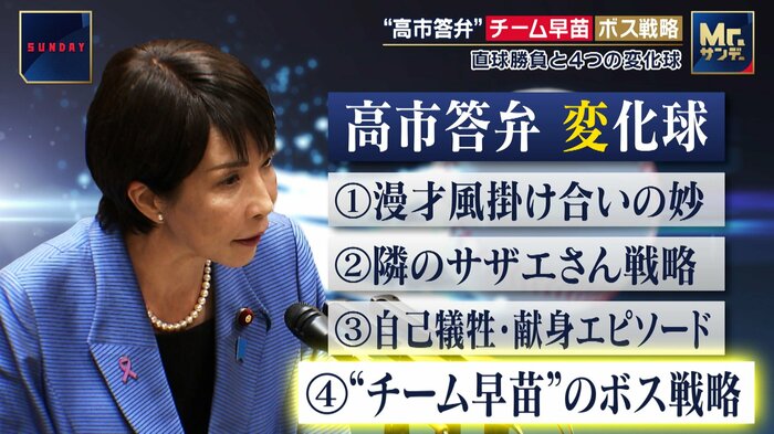 岡本氏は、質疑応答の中で、国会論戦らしい“直球勝負”に加え、主に4つの“変化球”が織り交ぜられることで、高市首相には予定調和ではない面白さがあると指摘する。